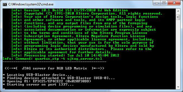 Open the command script tcl/run.cmd in a text editor and ensure that the path to the quartus_stp executable is correct. Then, double click the script to launch the Virtual JTAG interface server (tcl/vjtag_server.tcl). This binds to a TCP port to allow programs and scripts to write data to the FPGA through Altera's Tcl API.