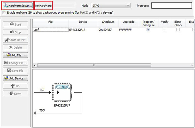 Note: In the future, you can use the command script de0-nano/program.cmd to quickly program the FPGA's SRAM with your .sof file (it uses the Quartus command line programming utility).