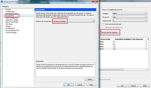 A window will open. Click "Device and Pin Options...". In the left hand side of the new window that comes up, open the "Unused Pins" category. Change the "Reserve all unused pins" settings to "As input tri-stated". This will essentially prevent the unused pins on the FPGA from doing anything unwanted on the DE0-Nano when we program the design.