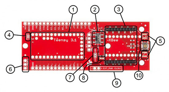 7. TNSY/EXT jumper - selects the source of power for the XBee (Teensy onboard regulator or EXT_IN)