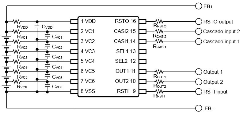 - Battery voltage monitoring of multiple modules is possible by connecting the upper module output to the CASI1 pin and the CASI2 pin