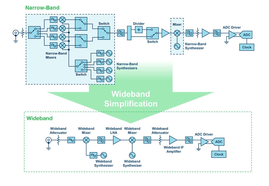 Electronic Test and Measurement (T&M)The test and measurement (T&M) instrumentation market has always needed wideband performance. Most applications in this market, such as spectrum analyzer, signal generator and vector signal analyzer cover wide frequency spectrum and require extremely good signal integrity. A single instrument needs to be able covers a wide spectrum of frequency bands (wideband requirement) and need ability to detect very low fidelity signals (low noise figure and high linearity). As a result, wideband performance is key. Traditionally, semiconductor companies had to tradeoff wideband performance for RF specs or the other way around. As a result, T&M designers used a lot of narrowband parts in parallel to cover wide frequency range. But such solutions were extremely complex, expensive and difficult to maintain. Analog Devices has now simplified the designs. Using wideband mixer parts T&M customers can get equivalent or better performance than narrowband parts, while also cover multiple frequency bands with just one part. Analog Devices features industry’s broadest portfolio of passive wideband mixers. As shown in the generic signal analyzer block diagram below, ADI’s wideband parts reduce the total number of parts needed, while ensuring improved performance and versatility of the hardware architecture for future designs.
