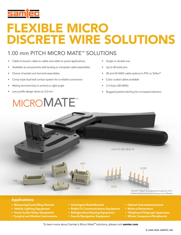 Micro Mate™ 1.00 mm pitch discrete wire cables and connectors feature a space-saving design that supports cable-to-board, cable-to-cable and cable-to-panel applications.