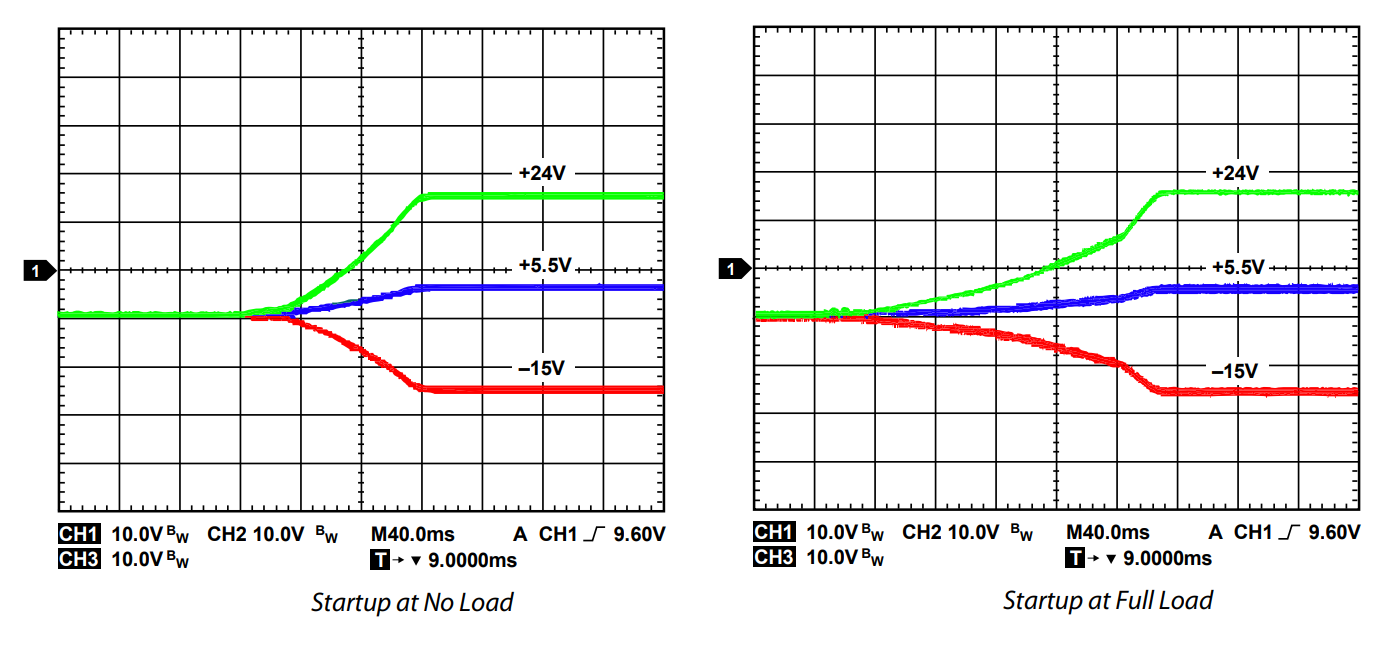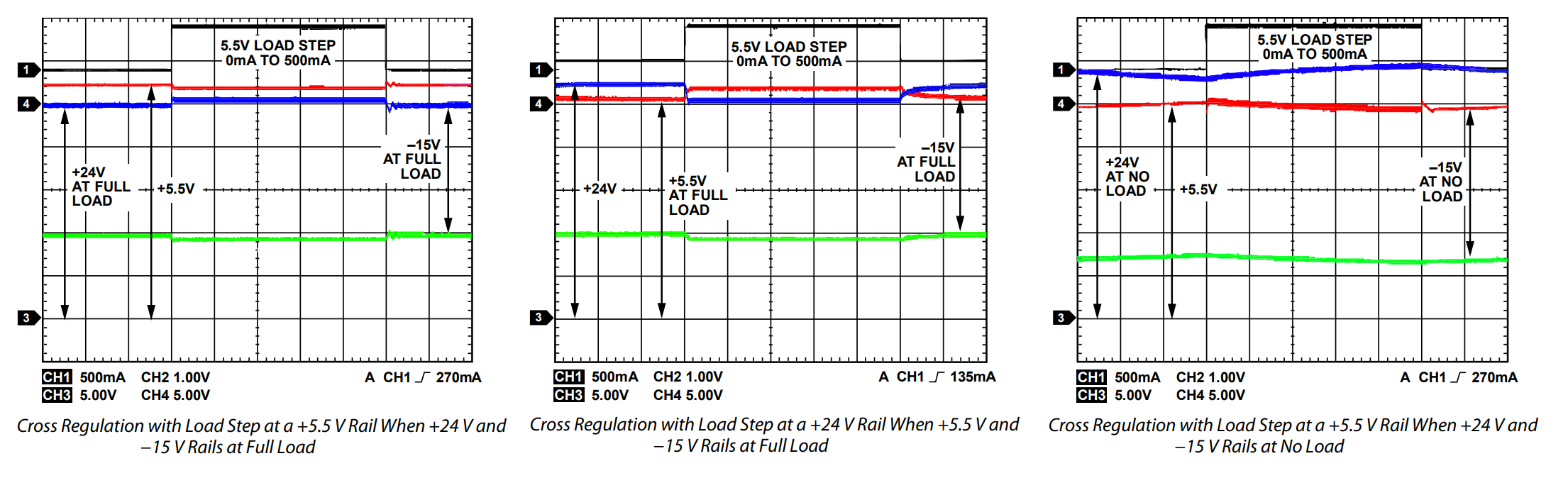 The evaluation board is set up to act as an isolated power supply solution that incorporates three output voltages (+5.5 V, +24 V, and −15 V) at a total rated power of 15 W. The evaluation board also provides 5 kV isolation in compact form factor, making it suitable for industrial applications, which usually have a variety of voltage rails.