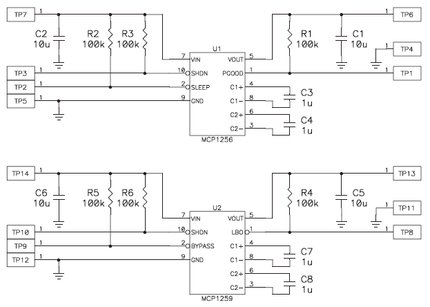The MCP1256/7/8/9 Charge Pump Evaluation Board is setup to evaluate simple, stand-alone, DC-to-DC conversion. Two evaluation circuits are provided, demonstrating the versatility of the MCP1256/7/8/9 device family. One evaluation circuit utilizes the MCP1256, demonstrating the SLEEP mode feature along with a power good indication. The other evaluation circuit utilizes the MCP1259, demonstrating the unique BYPASS mode feature, along with a low battery indication.