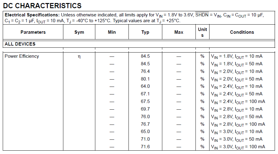 >76%, 2.8V in, 3.3V @ 50 ~ 100 mA |