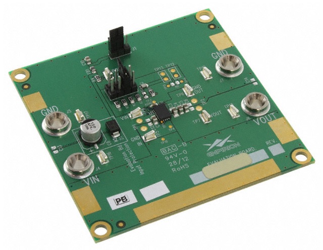 The base input capacitor configuration is a single 22uF 0805 MLCC. Refer to the product datasheet for input capacitor requirements. Output voltage programming is accomplished via a simple resistor divider. Jumpers are provided for 4 pre-configured output settings. These settings are as follows: 1.0V, 1.2V, 1.5V, 1.8V. Easy jumpers are provided for the following signals: enable and numerous test points provided as well as clip leads for input and output connections. The board comes with input decoupling and reverse polarity protection.