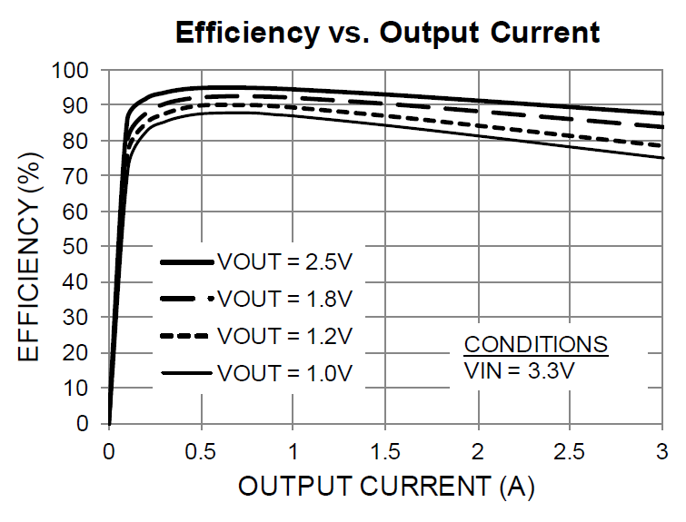 >88%, 5V in, 2.5V @ 0.3 ~ 3 A >88%, 3.3V in, 2.5V @ 0.1 ~ 3 A >84%, 3.3V in, 1.8V @ 0.1 ~ 3 A >82%, 5V in, 1.8V @ 0.3 ~ 3 A >80%, 5V in, 1.2V @ 0.3 ~ 2.6 A >80%, 5V in, 1.0V @ 0.3 ~ 2.2 A >80%, 3.3V in, 1.2V @ 0.1 ~ 2.8 A >80%, 3.3V in, 1.0V @ 0.2 ~ 2.2 A |
