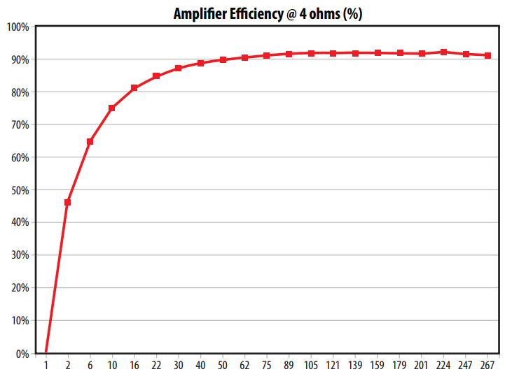 The EPC9106 reference design has demonstrated 96% efficiency at 150 W / 8 Ω, and 92% efficiency at 250 W / 4 Ω.