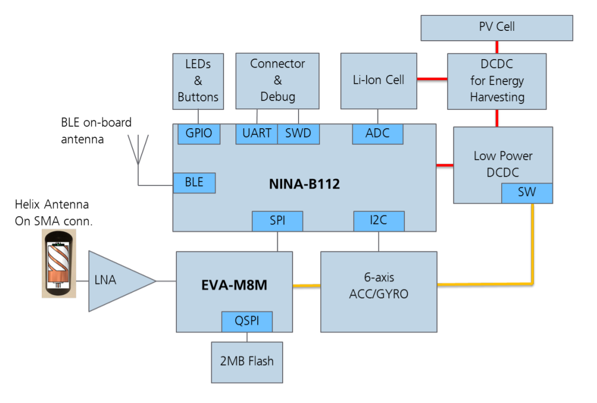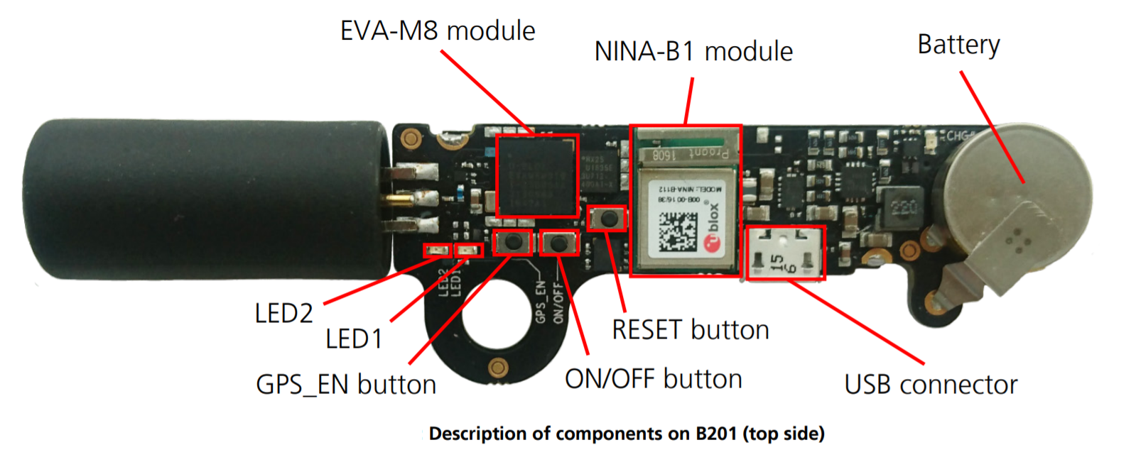 B201 is a location device that integrates the u-blox’ NINA-B1 and EVA-M8 series modules, thus making use of both the positioning and short range radio technologies. The hardware has been designed to optimize power consumption.